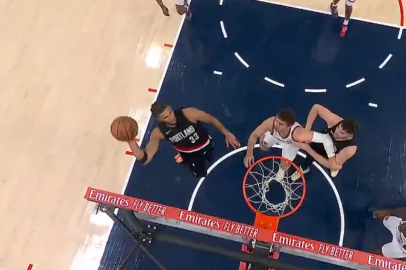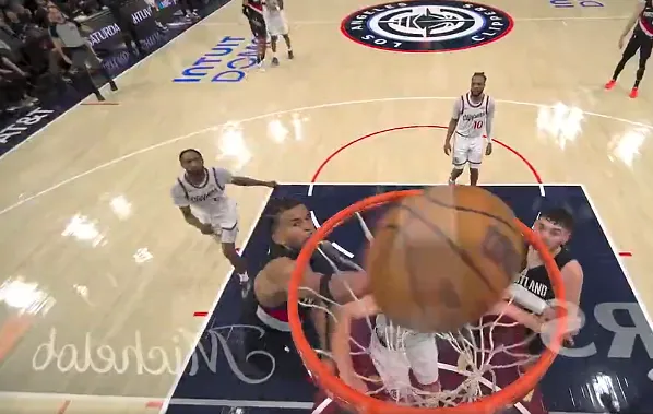 第三节比赛中,卡马拉空中摘板抡臂砸扣可惜扣飞,开拓者还领先快船10分。